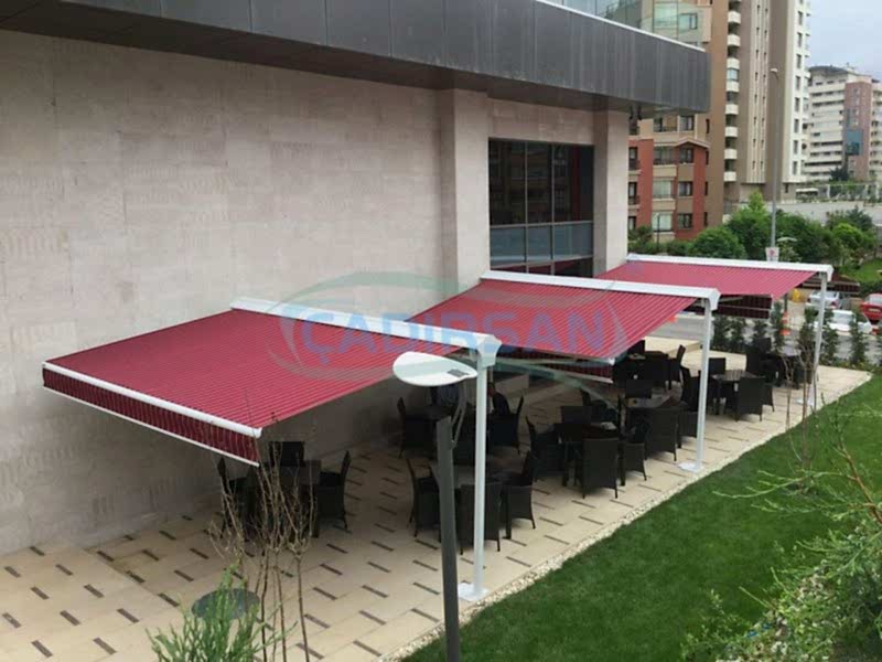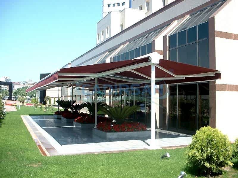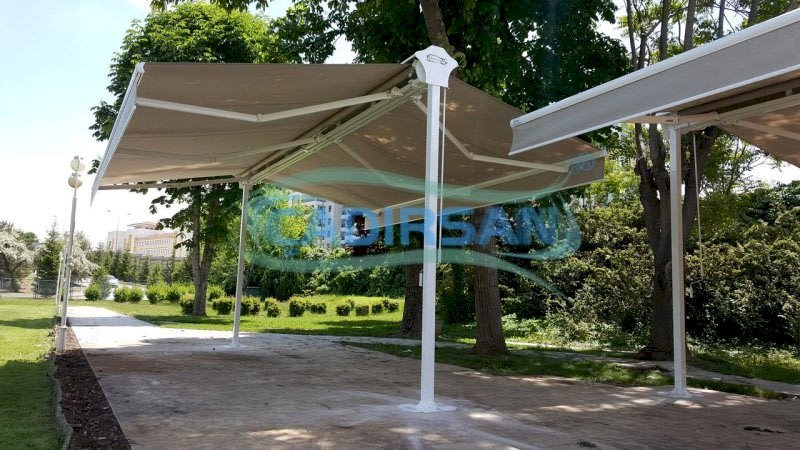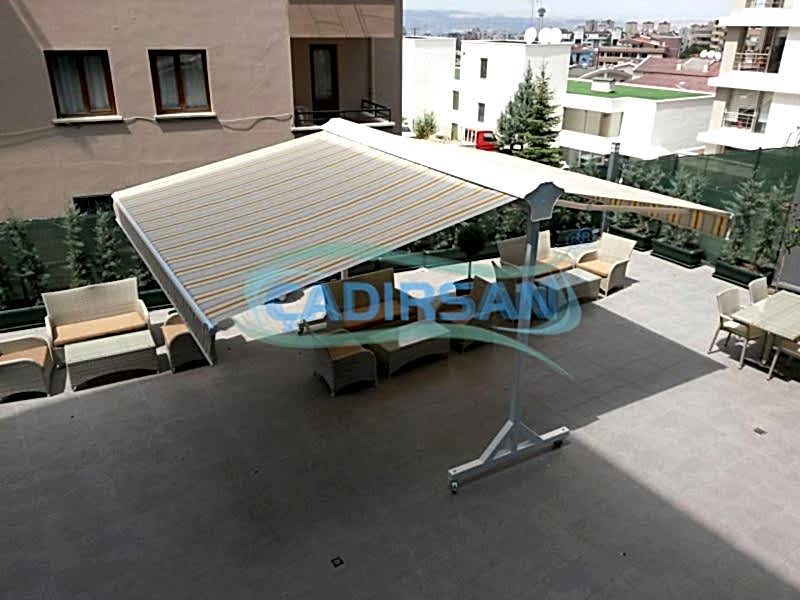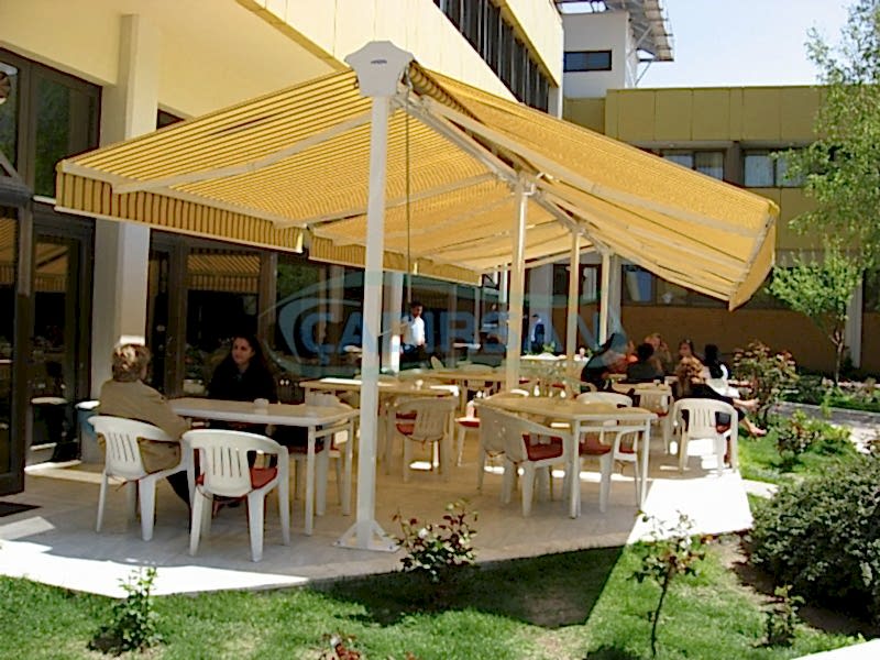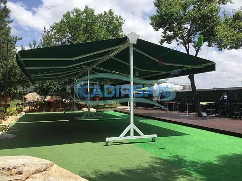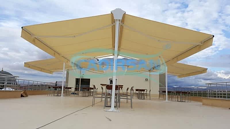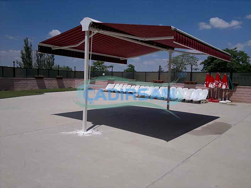 Çift yöne açılımlı tente modelimiz ister yere sabit ister tekerlekli sistem ile oldukça kullanışlıdır. Kasetli tente ve mafsallı tente sistemleri kullanılarak üretilir. Çift yöne açılımlı tenteler ister aynı anda iki yöne, sağa ve sola olmak üzere açılabilir ya da bir tente kapalı iken diğerlerinin açık kalması sağlanarak tente kullanım alanının isteğe bağlı olarak belirlenmesi sağlanabilir. Bu modelde konstrüksiyonun üst kısmına, tentelerin korunması ve aralarından aşağıya su akmaması için alüminyum koruma çatısı konulmaktadır. Branda özellikleri müşteri talebine göre değişiklik göstermektedir.