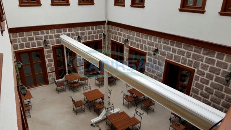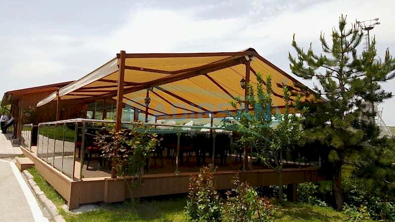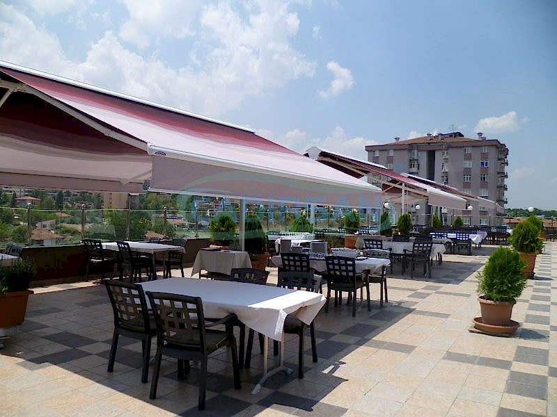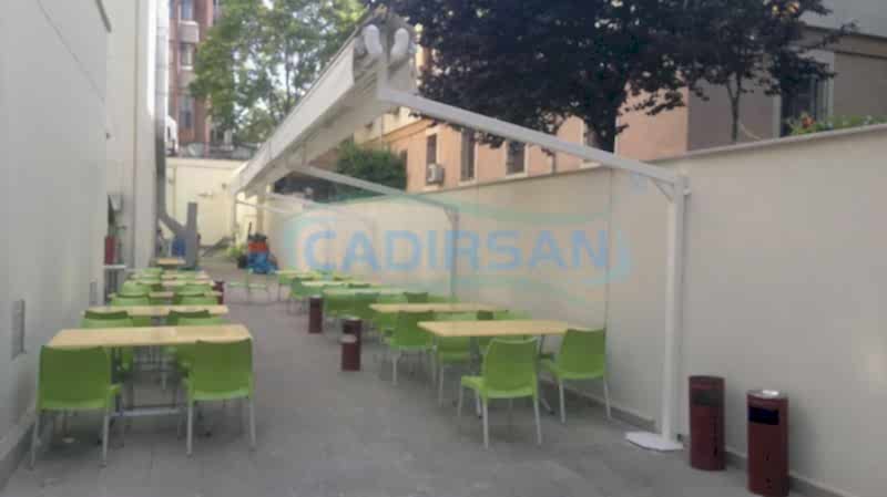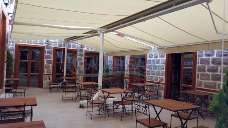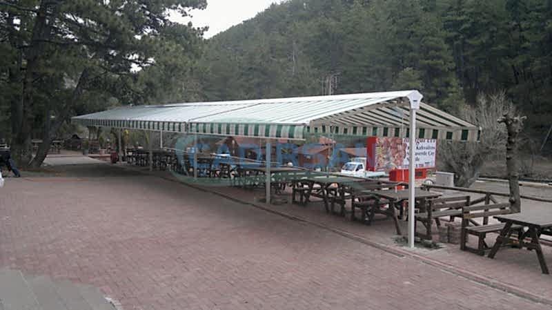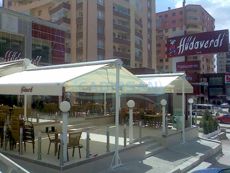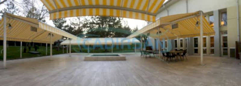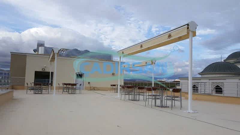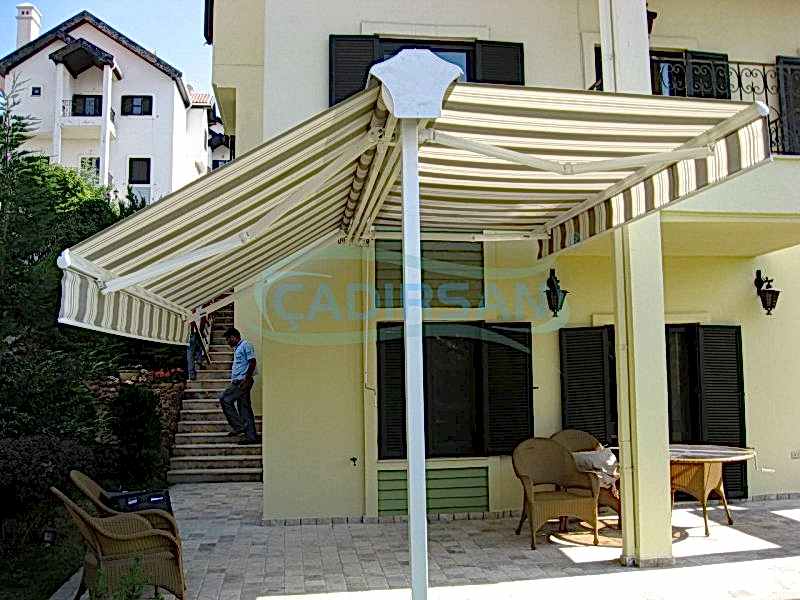 Çift yöne açılımlı tente modelimiz ister yere sabit ister tekerlekli sistem ile oldukça kullanışlıdır. Kasetli tente ve mafsallı tente sistemleri kullanılarak üretilir. Çift yöne açılımlı tenteler ister aynı anda iki yöne, sağa ve sola olmak üzere açılabilir ya da bir tente kapalı iken diğerlerinin açık kalması sağlanarak tente kullanım alanının isteğe bağlı olarak belirlenmesi sağlanabilir. Bu modelde konstrüksiyonun üst kısmına, tentelerin korunması ve aralarından aşağıya su akmaması için alüminyum koruma çatısı konulmaktadır. Branda özellikleri müşteri talebine göre değişiklik göstermektedir.